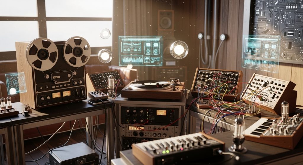 フェンダーのギター、ハモンドオルガン、アナログシンセサイザー。